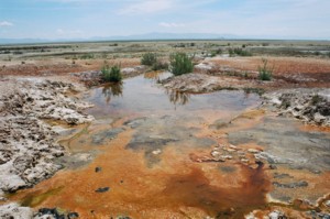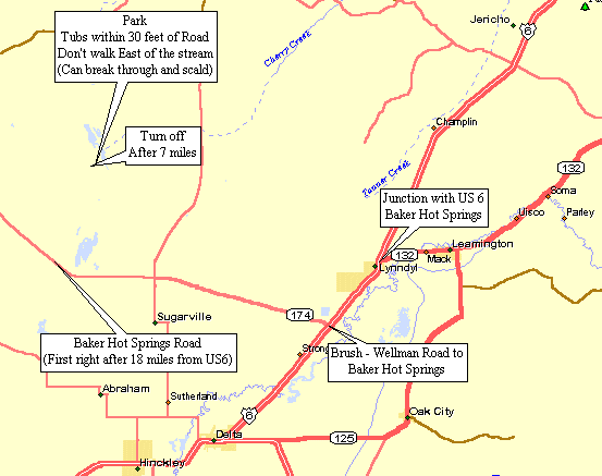 The tubs are 30 feet from the road. The clay road is passable only in dry weather or when the ground is frozen. There are three cement tubs 4ft X 8ft X 3ft to soak in. The hot water is 135 degrees and is cooled down by a cool springs. Do not walk east of the main stream that feeds the hot tubs because you can break through the thin crust into 180 degree water. Please leave the cold water running into the tubs and adjust the hot water. |