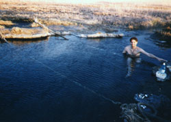 From the parking area you will see two gravel trails, one heading south and the other heading west. The trail that heads directly south takes you to the pool described above. The trail heading west takes you to two other pools. These two pools are not as warm as the first one, so they may be more to your liking on a hot summer afternoon, then in the dead of winter. On the western trail the first pool you will come across is clear like the main pool, however not as deep. This pool has a wooden dock constructed along one edge that hangs over the deeper end of the pool. It appears that this dock was intended to be used for jumping into the pool, however be cautious the pool does not appear very deep. To get to the third pool continue to head south on the western trail. On our visit this pool was very murky with film on top, however you could tell that it was very deep with no edges for sitting.